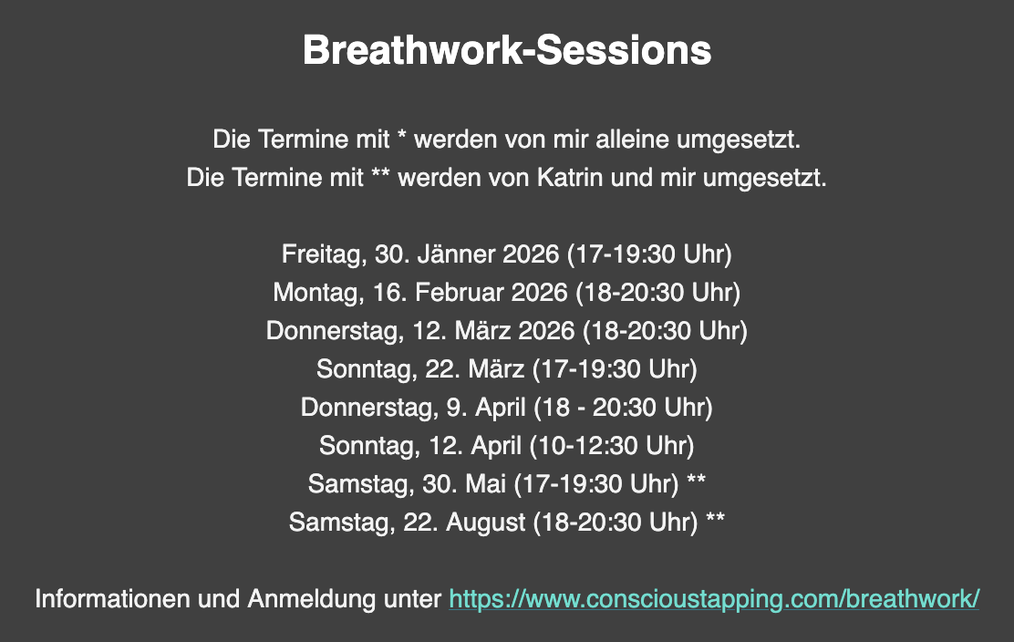 Mit der Unterstützung von Katrin Harry hat das nun erstmals stattgefunden: eine effektive, einfache, alltagskompatible Möglichkeit, um unterbewussten Strömungen und der inneren Weisheit Raum zu geben. Ein Methode die dennoch das Verkörpern benennt, Integration anbietet, und auch nach der Session den Raum hält — Themen, die bei anderen kürzeren Methoden oft nicht ideal umgesetzt werden. Es gibt nun viele weitere Termine, damit du dieses Angebot ausprobierne kannst — der nächste davon findet bereits diesen Freitag statt; Informationen und Anmeldung unter www.conscioustapping.com/breathwork/.