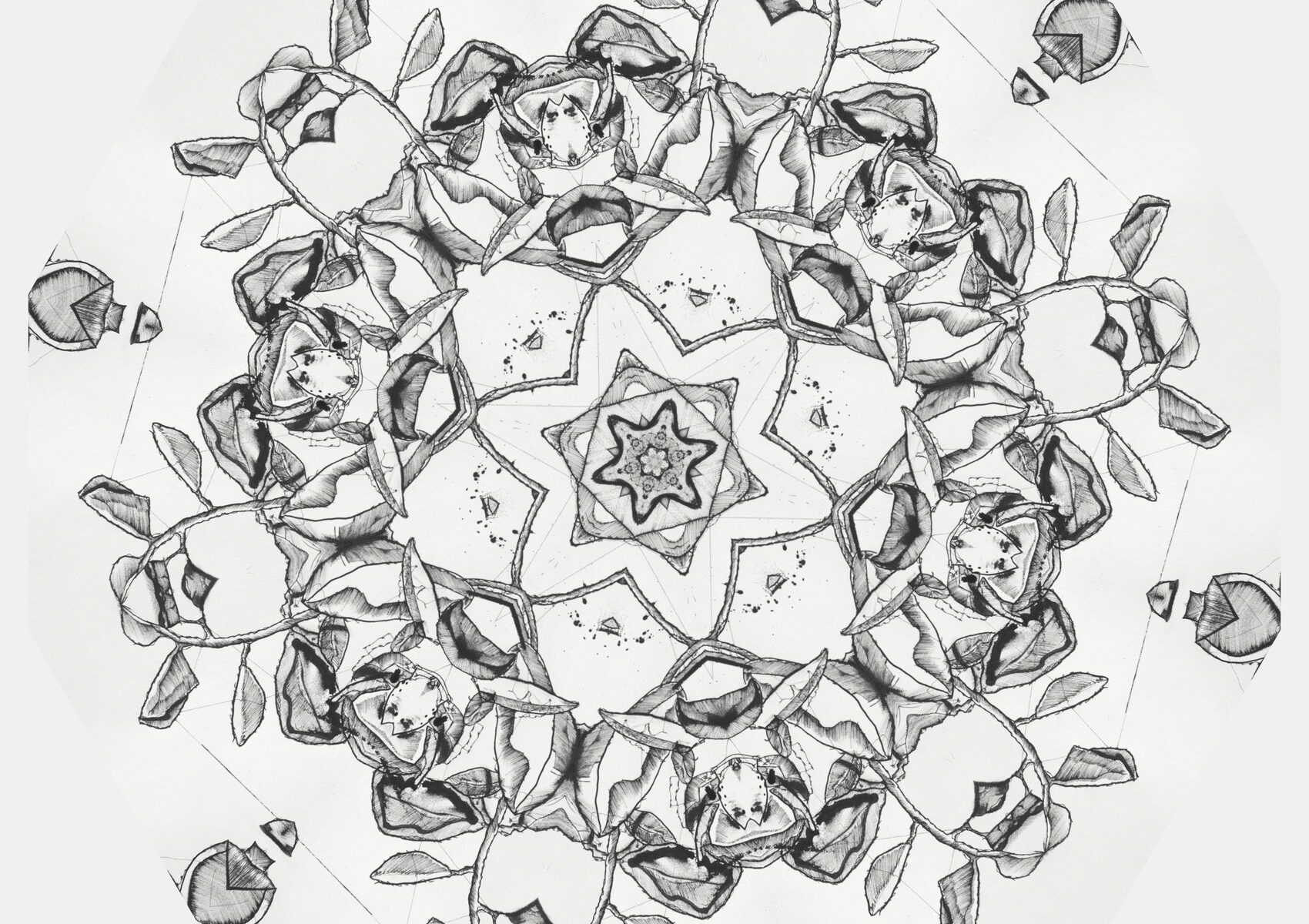“Floral” ist Teil der Kaleicoscope Works, die für mich eine unglaubliche Sogwirkung haben; sie tragen in ihrer perfekt gespiegelten Wiederholung eine gewisse Stärke und Sicherheit. Sie basieren auf mehrfachen Spiegelungen: was kann ein Spiegel zeigen? Und was bleibt durch den Blick auf die Oberfläche immer verborgen?