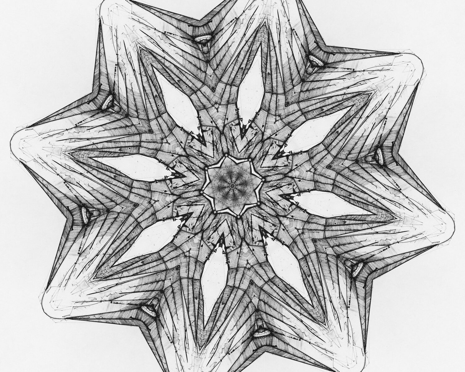 “Soul” ist Teil der Kaleicoscope Works, die für mich eine unglaubliche Sogwirkung haben; sie tragen in ihrer perfekt gespiegelten Wiederholung eine gewisse Stärke und Sicherheit. Sie basieren auf mehrfachen Spiegelungen: was kann ein Spiegel zeigen? Und was bleibt durch den Blick auf die Oberfläche immer verborgen?